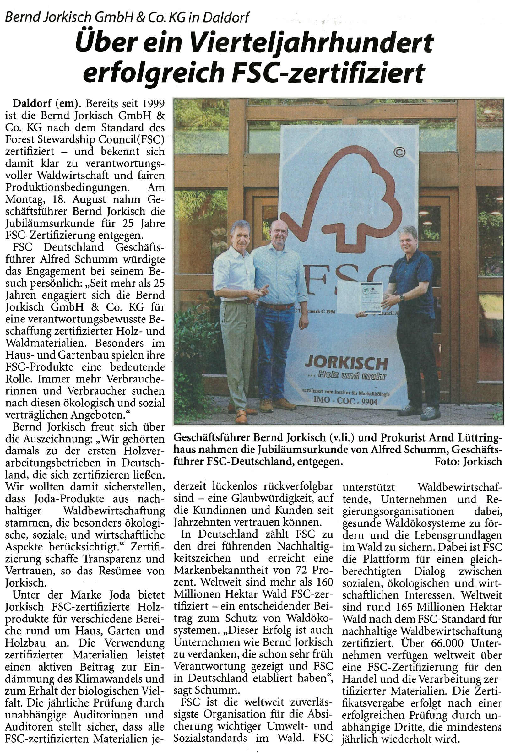 Bernd Jorkisch, Geschäftsführender Gesellschafter der Bernd Jorkisch GmbH& Co.KG im Interview mit dem FSC (Forest Steward Council), weshalb er sich schon vor einem Vierteljahrhundert für dieses renommierte Umwelt-Siegel für sein Unternehmen entschieden hat. Das Interview erschien im aktuellen Newsletter des FSC.